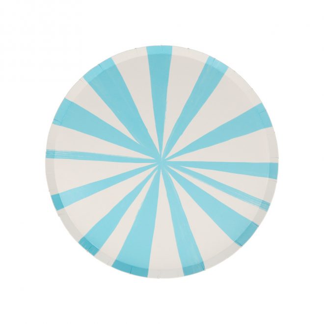 These wonderful blue striped side plates are the perfect color for a boy's birthday party or baby shower. They are crafted from high quality paper, so are practical as well as decorative.