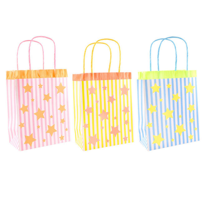 Celebrate a birthday star in style with these wonderful bright paper party bags, a stylish way to give your guests a cheerful send-off. Each bag features bold yellow, pink or blue stripes sprinkled with neon stars and finished with matching fringed tops for an extra joyful touch. Fill them with treats, toys or treasures to thank your guests in the most colorful and memorable way.
