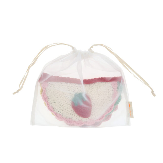 Add moments of magic to your table or room with this delightfully hand-crafted crochet scalloped garland, a charming way to bring this popular craft to your celebrations. Made from soft cotton yarn, it features six ivory semi-circle pennants attached with a red chain stitch. Each pennant is edged with a colored scalloped border in pink, mint, yellow or blue and adorned with stitched icons including a strawberry, flowers, cherries, a butterfly and a ladybird. Hang for everyday beauty or reuse for parties. It comes beautifully presented in an organza drawstring bag, ideal for stylish and safe storage.