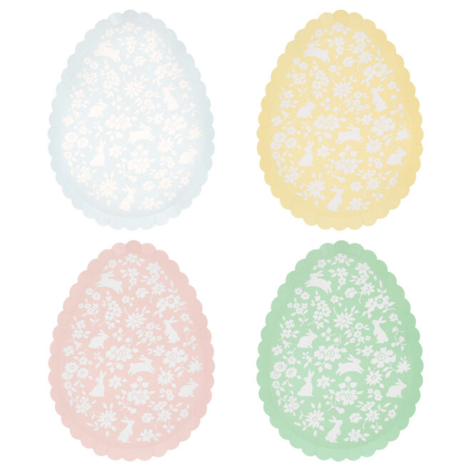 Set the table for springtime joy. These egg-shaped paper plates are a fresh, charming way to elevate your seasonal table. Featuring a ditsy floral pattern, adorable bunny illustrations and a softly scalloped edge, they're full of playful character with a polished finish. Each set comes in four beautiful spring shades, perfect for mixing and matching with the rest of your Easter tableware. Thoughtfully designed with a plain, colour-matched back – a special detail that sets them apart from the everyday – they look elegant from every angle.