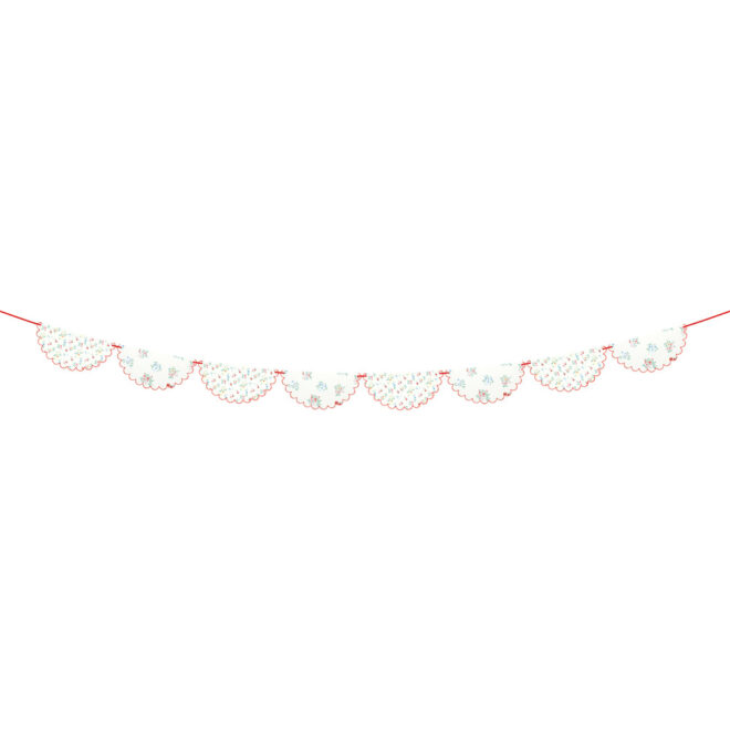 Dainty posy bouquets and ditsy floral clusters add effortless elegance to any setting. These classic designs are influenced by fashion-forward floral pattern trends, which include a touch of red to keep the look modern and fresh. This statement garland, with a stylish scalloped edge, will give a sophisticated look at baby showers, bridal showers, afternoon tea or garden parties. Hang it on a party table, wall or mantel or in a porch or window, for instant decor.