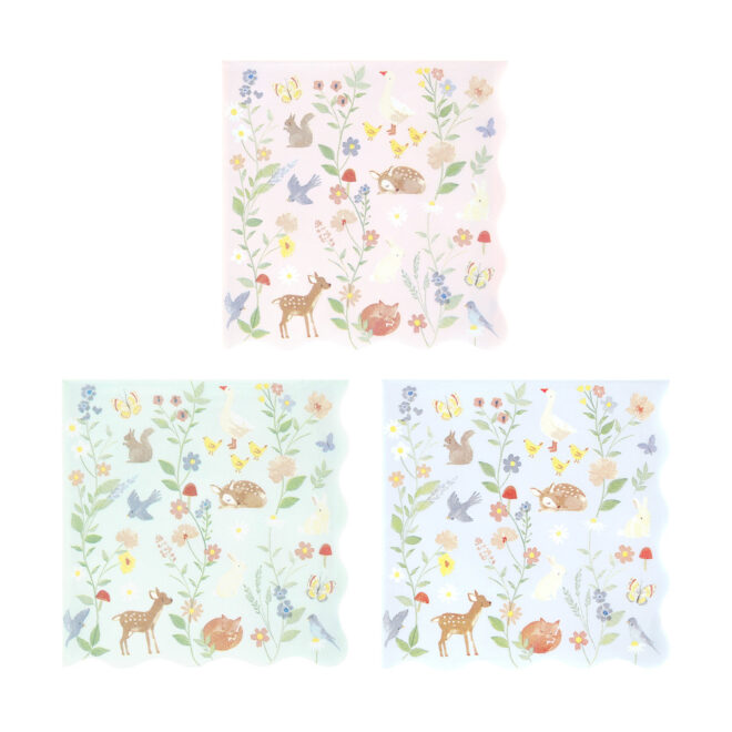 Our little animals range is brimming with storybook charm, inspired by vintage children’s books, 1940s animation and classic floral wallpaper. These large paper napkins feature soft watercolour animals, like geese and fawns, nestled among delicate flora, to bring gentle beauty to your party table. The waved edges add a whimsical touch. Perfect for young birthdays or baby showers.