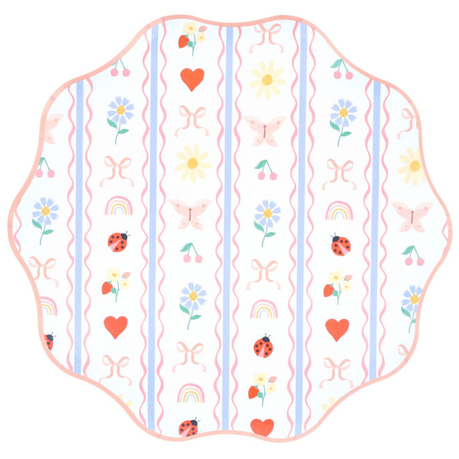 Blooming with playful detail, our Little Garden paper dinner plates will turn every meal into a celebration. The pretty textile-inspired pattern of ladybirds, hearts, butterflies, cherries, bows, flowers and rainbows enchants in soft pink, red and blue tones. Finished with a wavy pink border and pink reverse, they look elegantly charming from all angles. Fun, fresh and full of joy, they're ideal for baby showers and birthdays from first candles to teenage dreams.