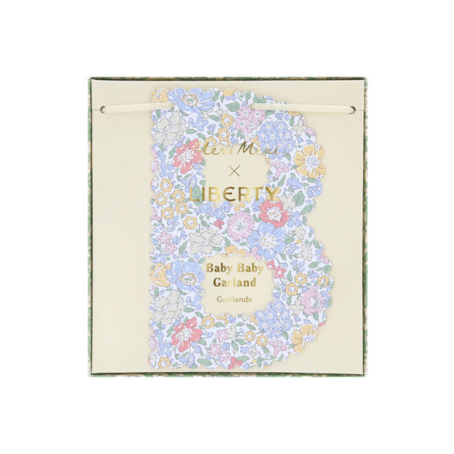 Celebrate new arrivals in style with this charming baby garland. Featuring a soft, colorful mix of classic Liberty designs, it’s perfect for boys and girls alike and can be reused time and time again – from baby showers to nursery décor. The scalloped paper letter pennants are pre-strung on a sumptuous cream velvet ribbon, making it easy to hang in a doorway, on a wall, or above a mantel for an instant touch of joy.