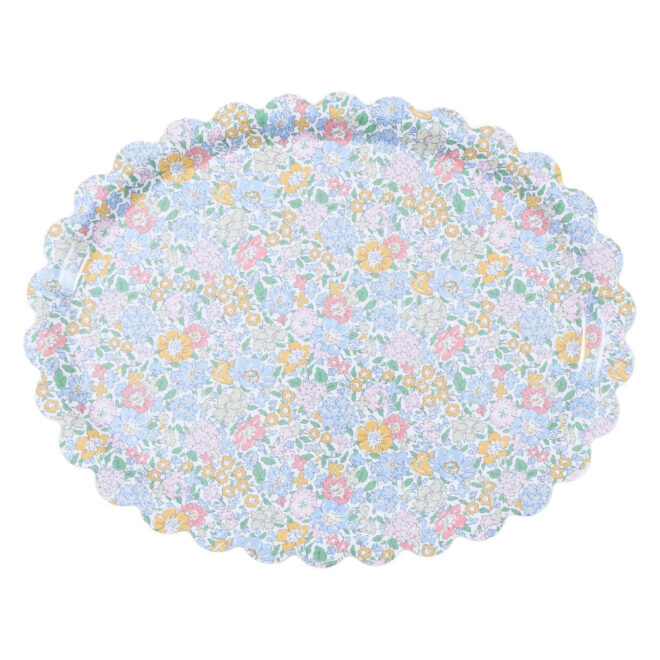 Part of our collaboration with Liberty, these statement trays combine practicality with style. A floral Liberty print design, with prominent blue, pink and yellow tones, is teamed with a scalloped edge for a sophisticated look. This oval tray is made from birch veneer plywood with a melamine coating, for durability without compromising on elegance. Ideal for carrying and presenting food and drinks, for breakfast in bed, or as a base for decorative displays or storage.