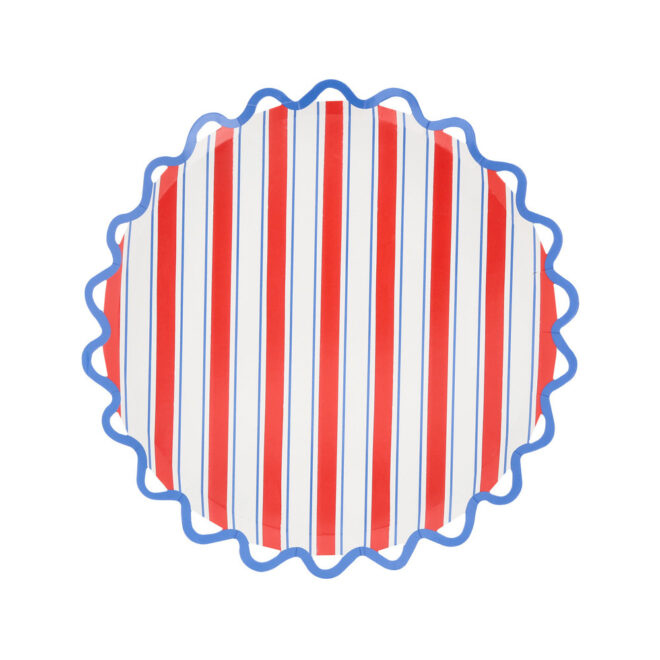 Set sail for stylish celebrations with these striking paper side plates. Featuring bold red, white and blue stripes and a delightful waved edge for a breezy effect, they'll bring seaside charm to any table. Perfect for chic summer gatherings or playful children’s parties with a nautical theme, this design captures the spirit of sunny days, salty air and effortlessly elegant entertaining.