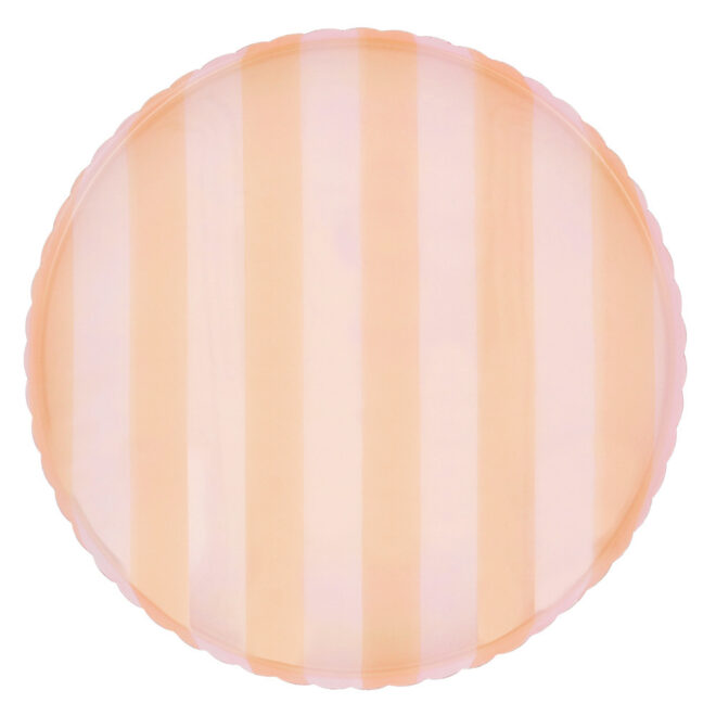 This striking metal tray pairs pastel pink and orange stripes with a clear enamel coating for a fresh, contemporary look. Its elegant upright scalloped edge adds just the right amount of classic flair. Perfect for styling dressing tables and hallways, use it to display decorative items, accessories, keys, candles, or beauty products, it's as practical as it is striking. Ideal to bring effortless charm to everyday moments. It also makes a timeless keepsake and a special host gift.
