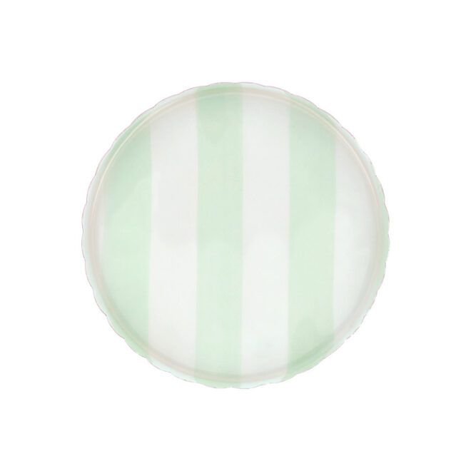This striking metal tray pairs pastel blue and yellow stripes with a clear enamel coating for a fresh, contemporary look. Its elegant upright scalloped edge adds just the right amount of classic flair. Perfect for styling dressing tables and hallways, use it to display decorative items, accessories, keys, candles or beauty products, it's as practical as it is striking. Ideal to bring effortless charm to everyday moments. It also makes a timeless keepsake and a special host gift.