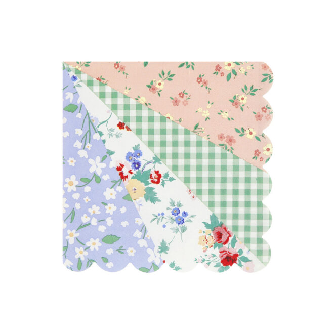 Bring the charm of patchwork to your table with these large paper napkins. Featuring a delightful mix of blue, green, peach and pink tones with delicate floral and gingham details, each napkin is finished with a pretty scalloped edge. Perfect for layering with other tableware or for adding a stylish flourish on their own, they’re ideal for baby showers, bridal showers, birthdays and any spring or summer celebration that calls for a touch of rustic beauty.