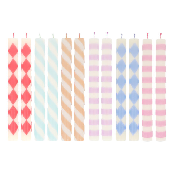 Add an extra layer of style to any party with our patterned table candles. They're perfect as a table centrepiece, or to place on the mantel or at strategic points in the room for a soft glow. And, if you don't light them, you can reuse them again and again for a decorative touch. The vibrant patterns, and colored wicks, make this a wonderful gift set too.