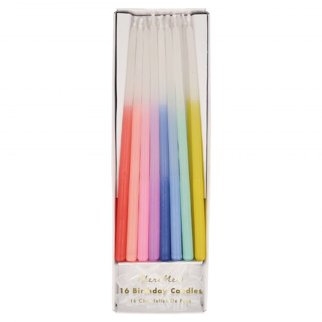 Add a rainbow of color to your cakes with these gorgeous candles. Each pack contains sixteen beeswax dipped candles in eight beautiful shades of red, pink, blue, green and yellow. Perfect for any celebratory cake occasion, like birthdays or anniversaries.