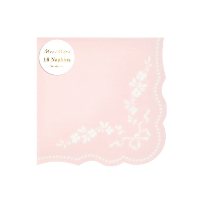 Inspired by classic elegance and designed to delight, these pastel pink large paper napkins feature white ornamental patterns echoing rococo details. Their sculptural wavy edges are finished with delicate pearl-like accents for subtle sophistication. Perfect for alfresco lunches, high teas, spring soirées, baby showers or bridal showers, they bring a graceful finishing touch to grown-up gatherings.