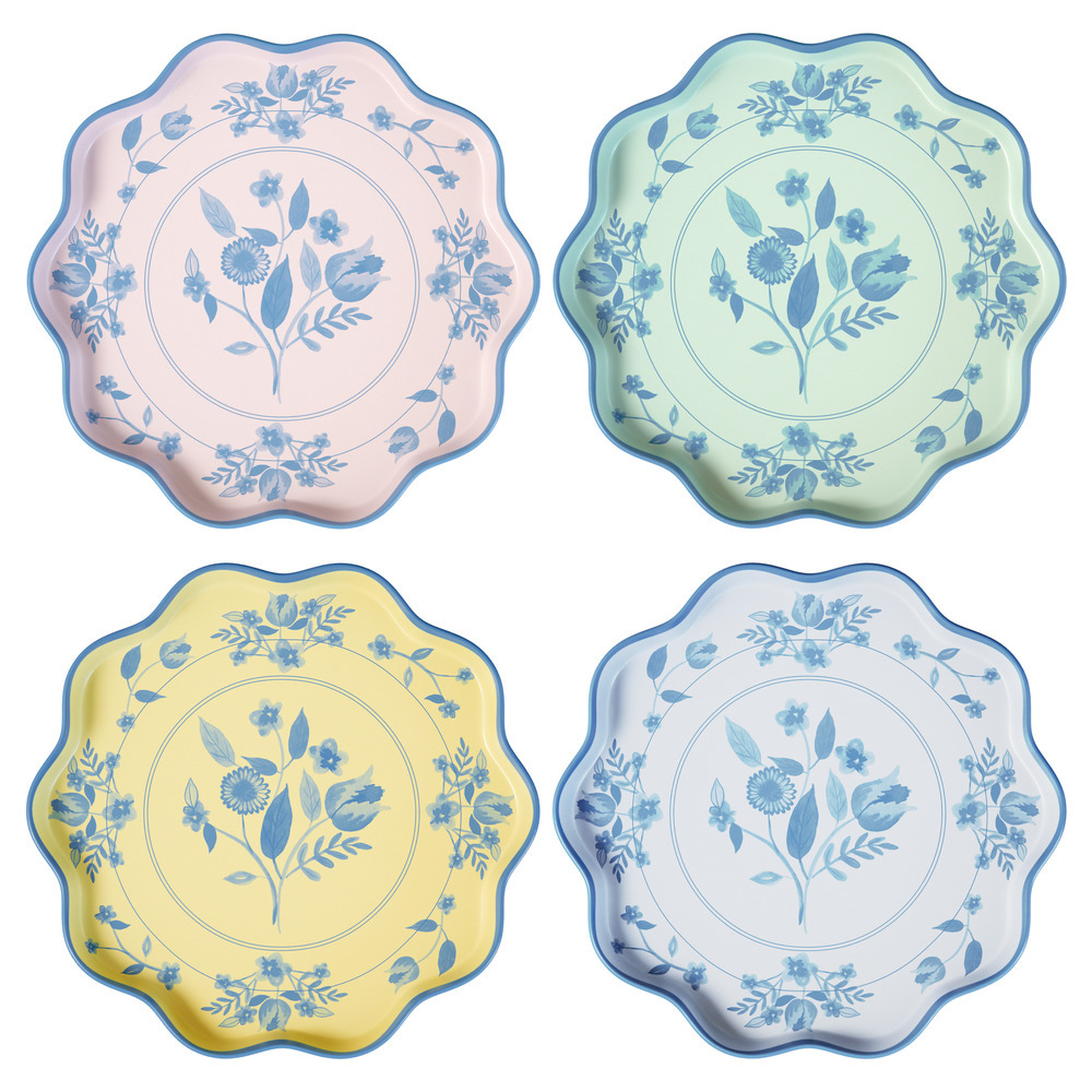 Create a sophisticated table setting with this set of pastel reusable large plates. Soft shades of pink, blue, green and yellow, provide a fresh backdrop for delicate cobalt blue botanical illustrations. Inspired by vintage dinnerware, the design brings timeless style, while a waved edge adds refined detail. Ideal for spring soirées, bridal showers, chic picnics, baby showers or any grown-up gathering.